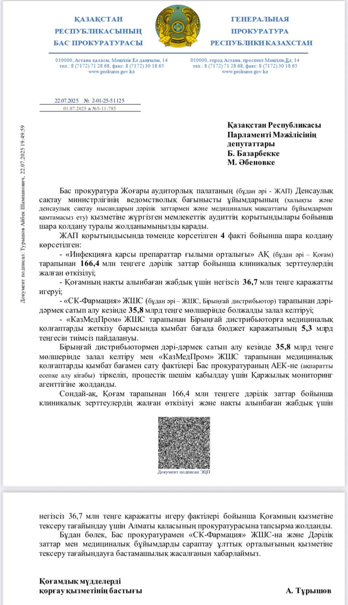 Депутат бұдан бөлек, Бас прокуратура «СК-Фармация» ЖШС мен Дәрілік заттар мен медициналық бұйымдарды сараптау ұлттық орталығының қызметін тексеру бастамасын көтергенін де жазды.